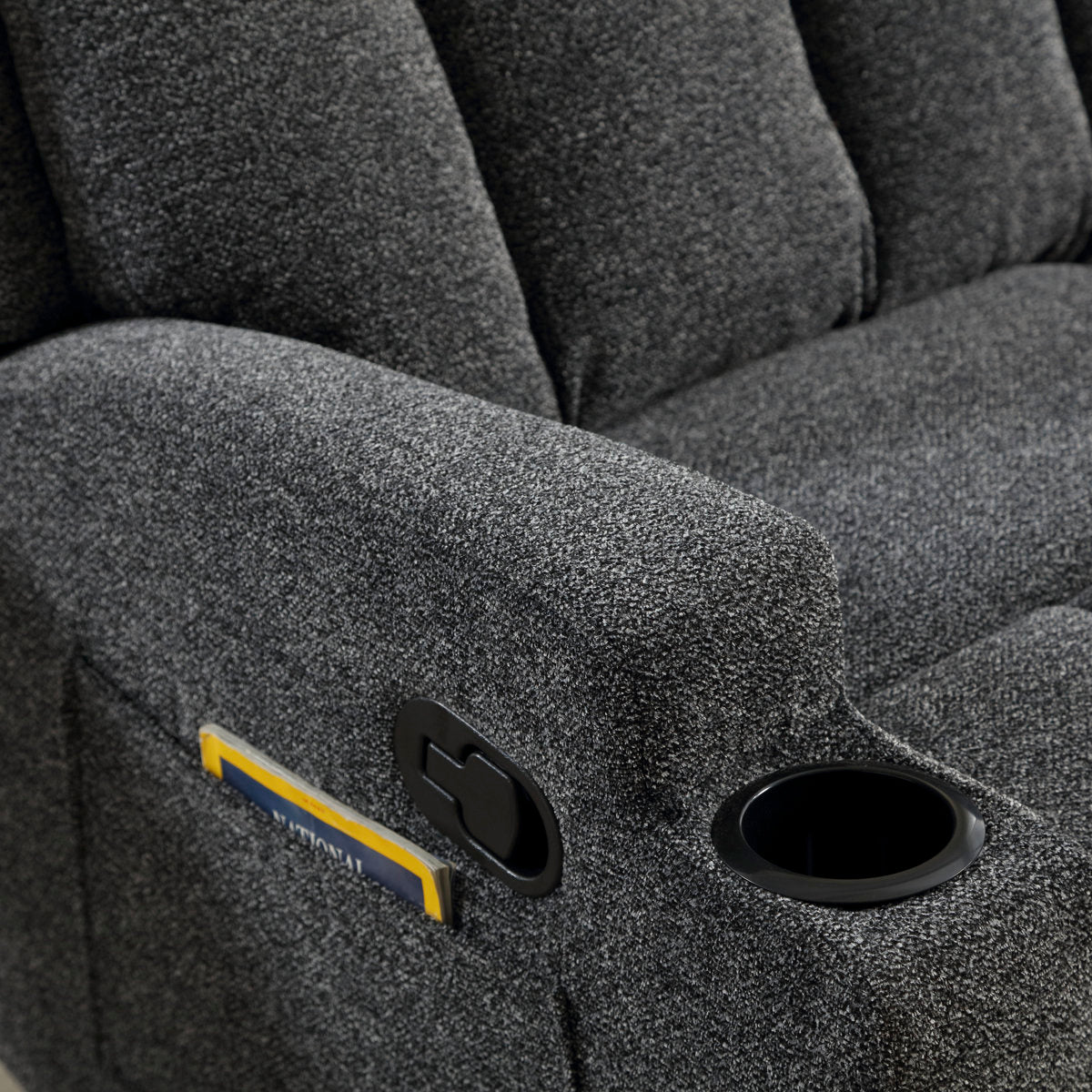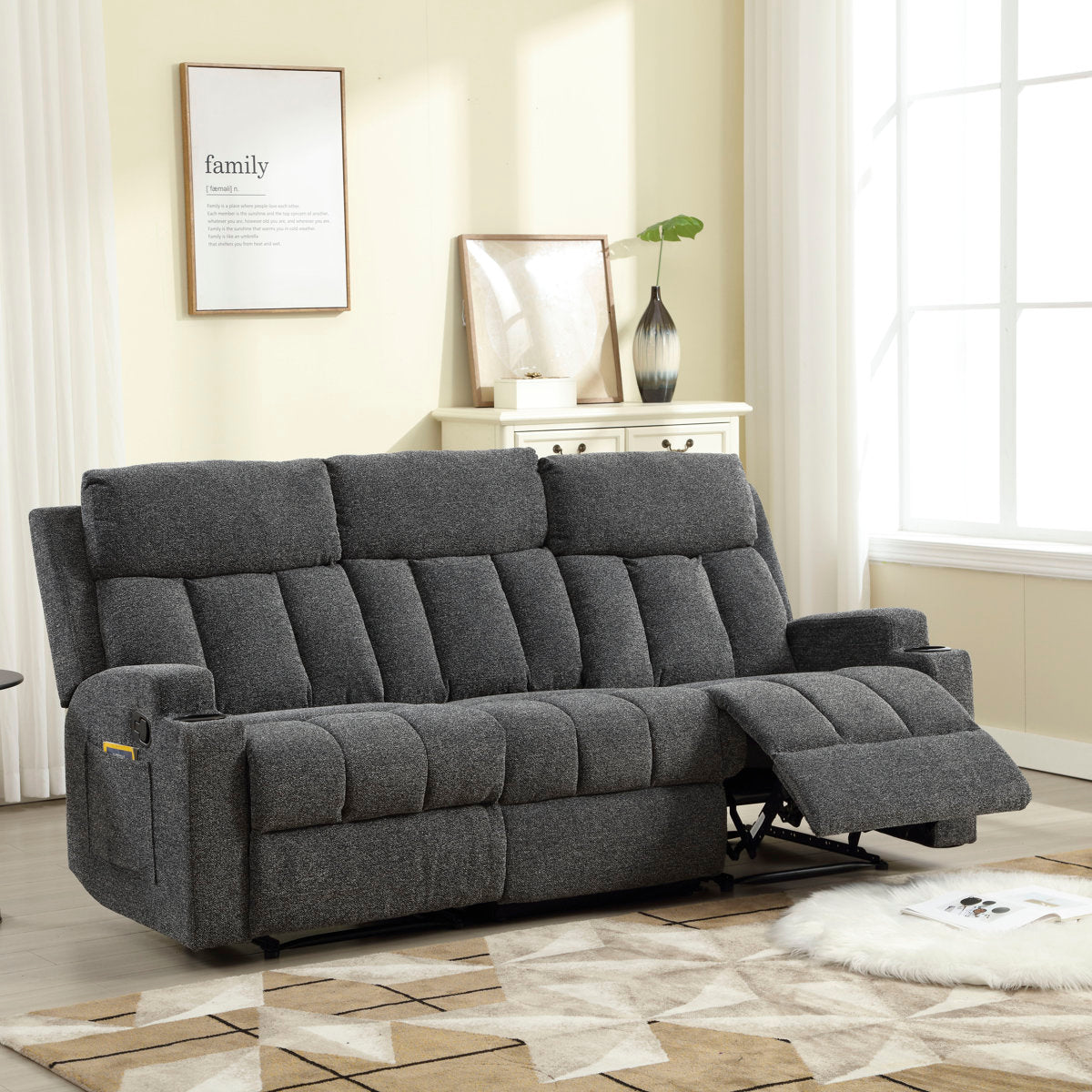 This comprehensive suite includes a generously sized manual reclining sofa, a cozy reclining loveseat, and a state-of-the-art manual massage recliner chair, each outfitted with built-in cup holders for your convenience.The Sofa - At 79.13 inches wide with a 68.11-inch seating wide, this sofa offers ample space to stretch out or gather with loved ones. The manual recline feature allows you to effortlessly adjust your position, ensuring comfort tailored to your desire, while built-in cup holders keep your favorite beverages within easy reach.The Loveseat - Complementing the sofa, the loveseat measures 56.69 inches in width and provides a 45.67-inch seating width. It mirrors the sofa’s functionality and adds to the aesthetic coherence of your space, making it perfect for smaller areas or as a secondary seating option.The Massage Recliner Chair - Complete your relaxation zone with the 33.07-inch wide massage recliner chair, equipped with dual cup holders and a soothing heating function. Enjoy personalized comfort with manual massage settings that help unwind and rejuvenate after a long day.Crafted with durable materials and designed with your comfort in mind, this living room set integrates seamlessly into any modern decor, providing both style and substance. Whether you're hosting a movie night, reading your favorite book, or simply relaxing, this living room set ensures every moment at home is a luxurious experience.
