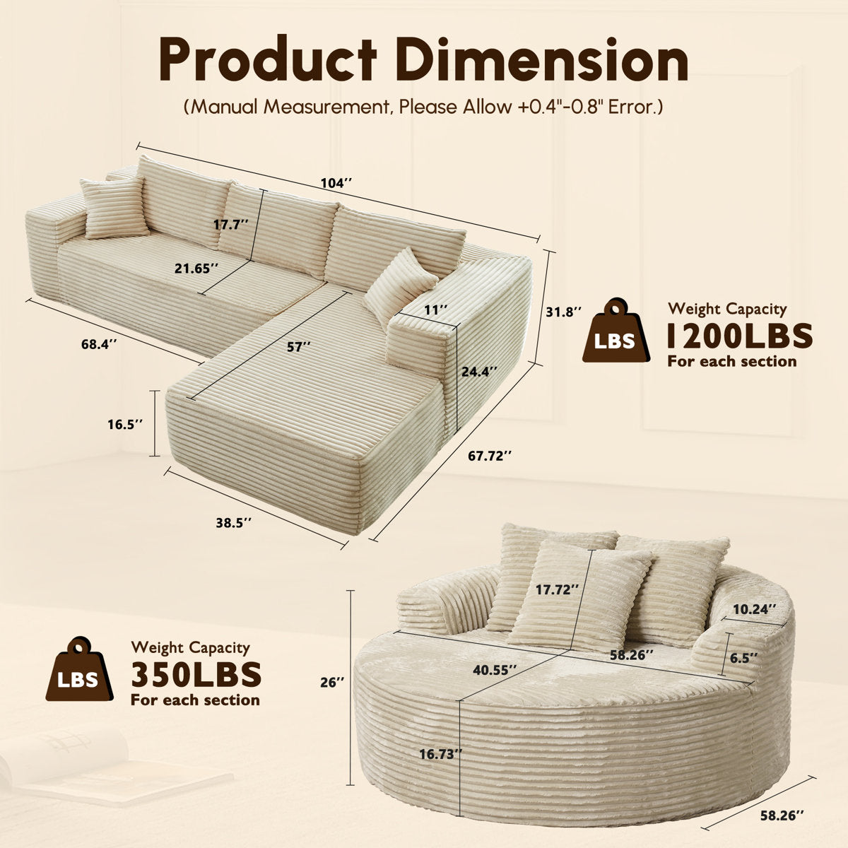 3-Piece No-Assembly Living Room Set, Modern Sectional Sofa With Loveseat And Chaise Lounge