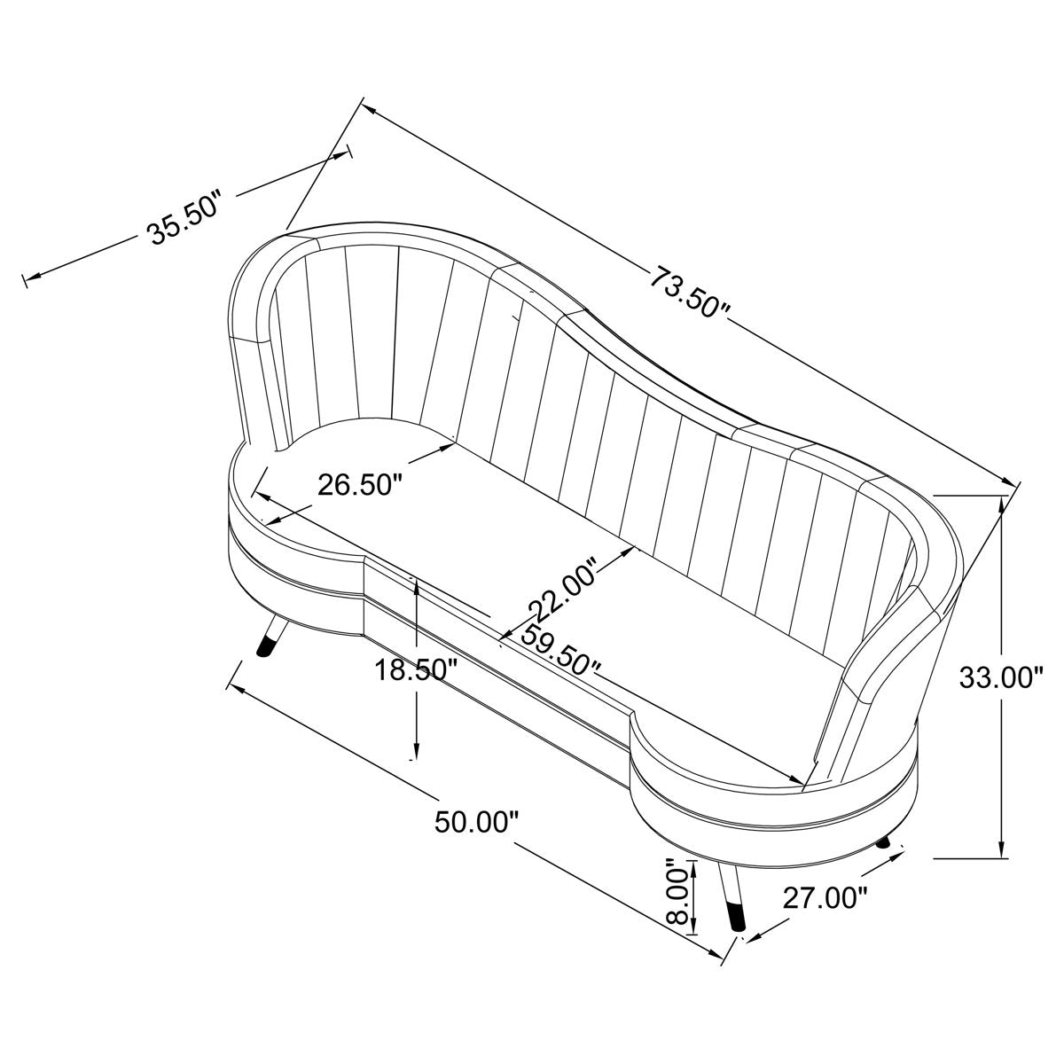 Inspired by artistic mid-century design, this two-piece sofa set adds romantic allure to any space. Featuring plush gray velvet upholstery and gleaming gold-finished tapered legs, it creates a striking focal point. Also available in blue, this set offers a stylish alternative to suit your décor. Vertical channel tufting and curved kidney-shaped backs evoke the charm of retro parlor style. Built with a solid wood frame and sinuous springs for lasting comfort. Set includes one sofa and one loveseat.