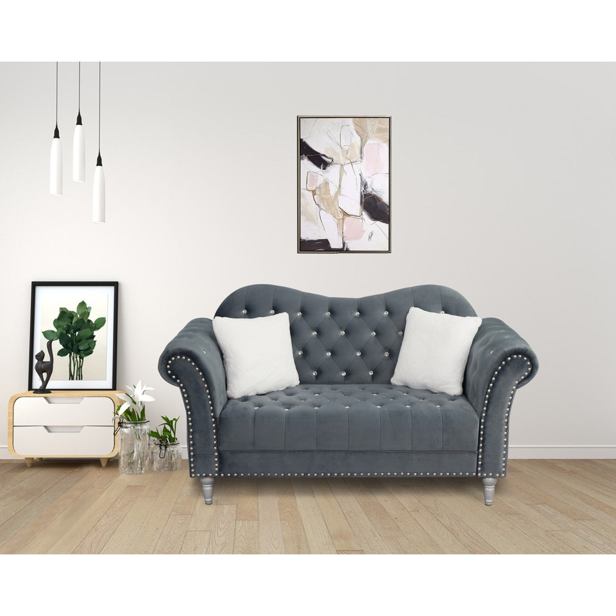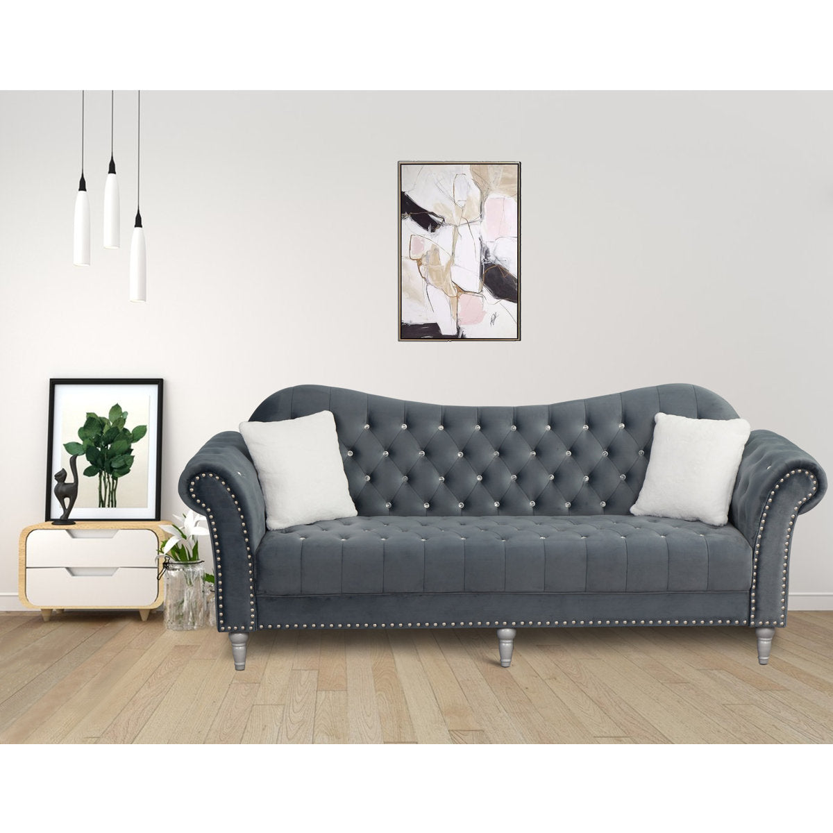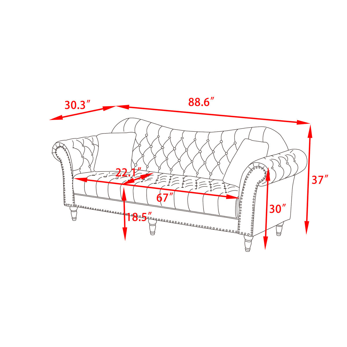 Bring a touch of lightness and elegance to your interior decor with a sophisticated sofa that offers luxurious comfort and classic styling to your home. Our chesterfield-style sofa emphasizes natural curving and classic ornamentation such as deep button tufting, rolled arms, bun feet, and nail head accents to tie your living room together with refined charm. Featuring smooth upholstery and a gracefully curved backrest, this sofa stands as a streamlined statement piece that can change the whole flow of your interior space.