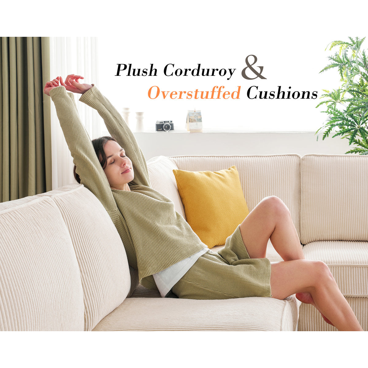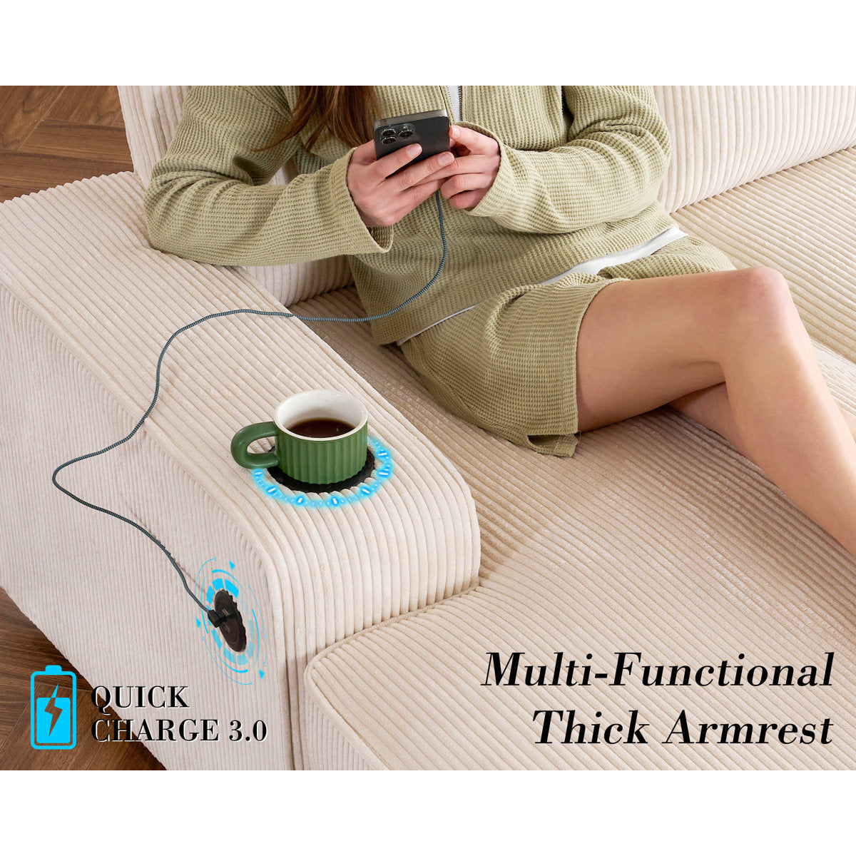 This sectional sofa is all about comfort and convenience, making it a great choice for family gatherings or cozy movie nights. Upholstered in soft corduroy, it offers a cushioned back and square seats that invite you to sink in and relax. The sofa's thoughtful design includes built-in cup holders and USB ports, so your essentials are always within reach. Plus, with seating for seven, there’s plenty of room for everyone. The metal frame and sinuous spring seat construction provide a supportive foundation, while the integrated storage drawers offer a handy spot for stashing blankets or magazines.